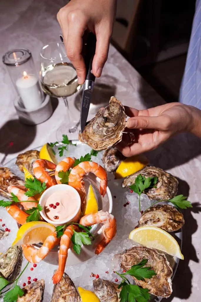 Face à la mer, des saveurs de-ci de-là ne laissent pas en reste les ichtyophiles qui s’enthousiasment devant la pêche du jour soigneusement présentée ; à la couasse ou sur son étal de fruits de mer qui comme chaque année prend place à la vue de l’automne. La cuisine est comme le lieu, élégante, franche et sincère aux produits frais et de saison garantis.